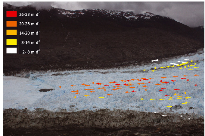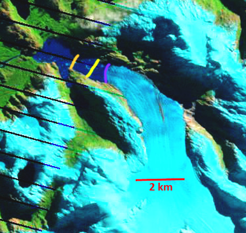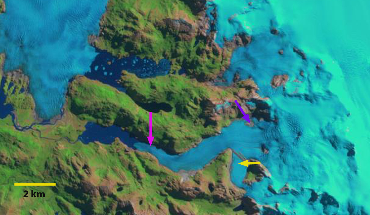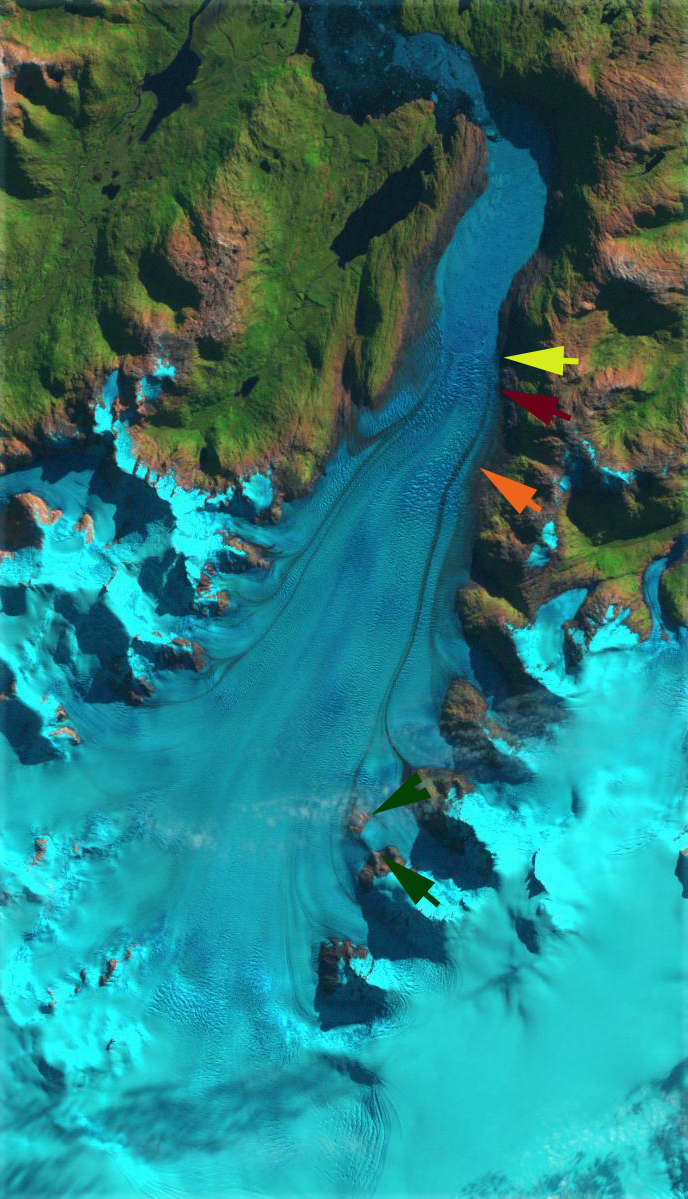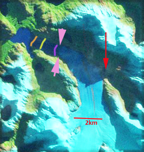 RG150 in Google Earth image looking upglacier in 2015. Red arrow indicates 1984 terminus and yellow arrow 2015 terminus and purple arrows indicate wind features at the top of the glacier.