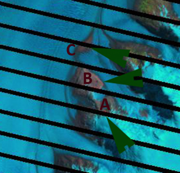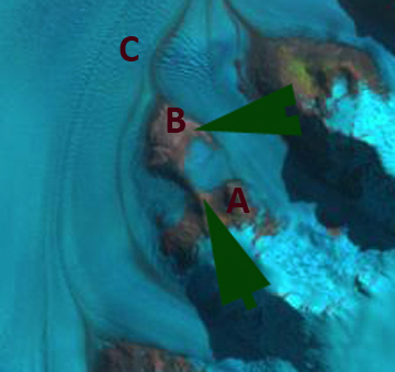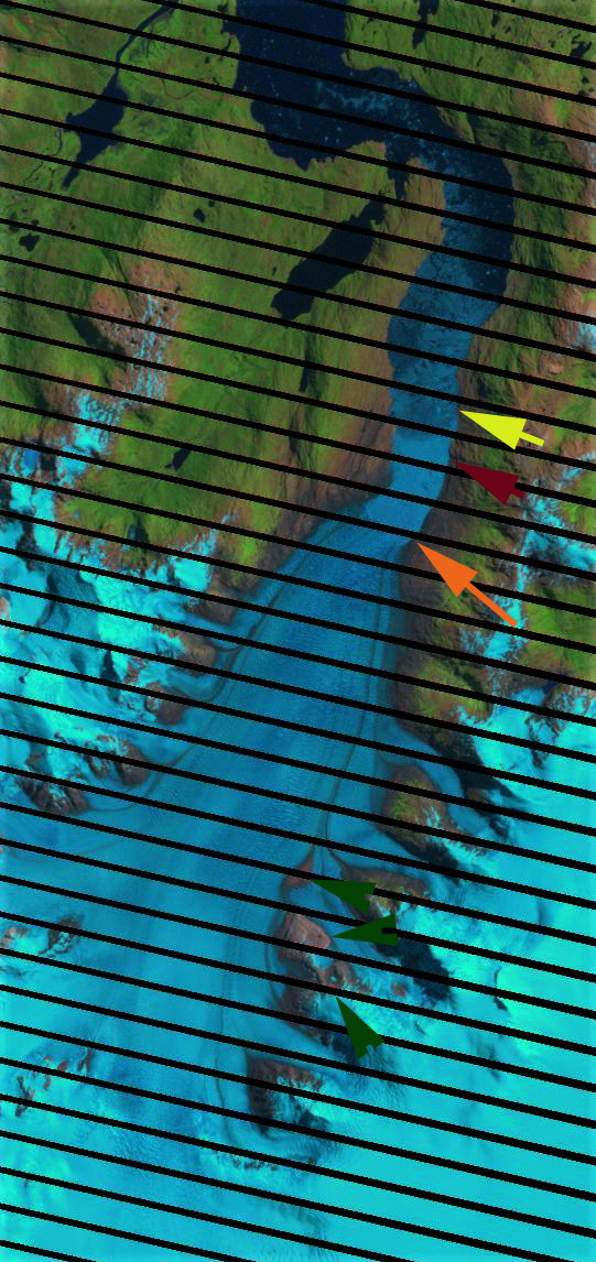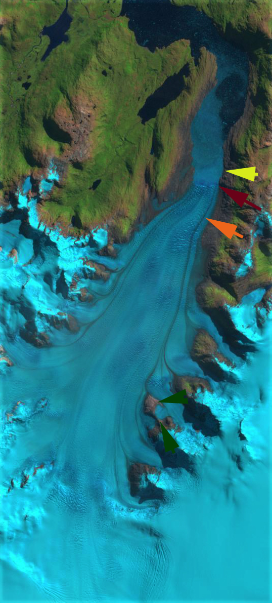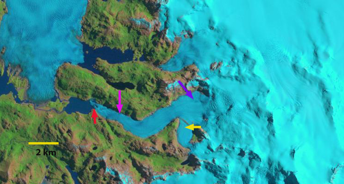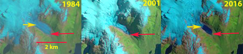 Retreat of RG150 indicated in Landsat images from 1984, 2001 and 2015. Red arrow indicates 1984 terminus and yellow arrow 2015 terminus.