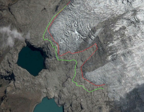 The retreat of this glacier mirrors that of Arhuey Glacier (A), which terminated in the newly forming Arhuey Lagunacocha. By 1995 and 1996 the terminus tongue is more distinct and the lake is 400-500 m long. By 2015 and 2016 the glacier has retreated to the far end of the lake basin, though still in contact with the lake By 2017 the lake is 1150 m long, indicating a 700 m retreat since 1992. The upper portion of the glacier remains incredibly crevassed indicate vigorous accumulation and motion. The glacier has a relatively small ablation zone with the loss of the flatter terminus reach, and should have a reduced rate of retreat. The glacier now has a reduced but still significant ability to release ice avalanches into the lake. The glacier fits into the Cordillera Blanca regional pattern which has experienced a 22% glacier loss from 1970-2003 (Racoviteanu et al, 2008).