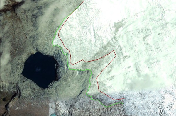 Safuna Glacier (S) and Arhuey Glacier in 1996 and 2016 Landsat images indicating glacier retreat from the 1992 terminus red arrow to the 2017 terminus position yellow arrow. Snowline indicated by purple dots.