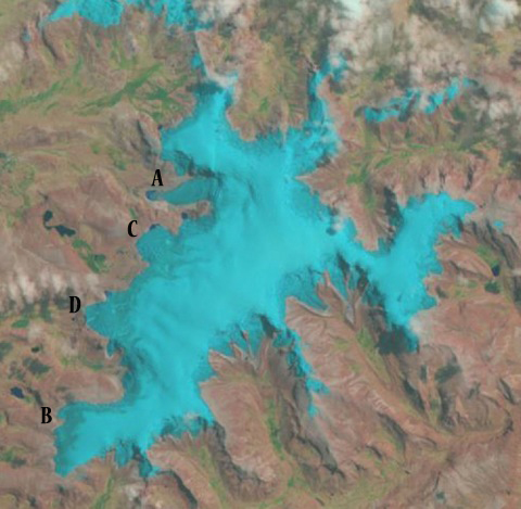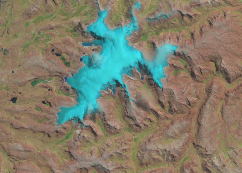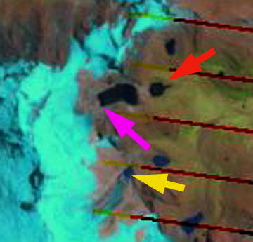 Safuna Glacier (S) and Arhuey Glacier in 1996 and 2016 Landsat images indicating glacier retreat from the 1992 terminus red arrow to the 2017 terminus position yellow arrow. Snowline indicated by purple dots.