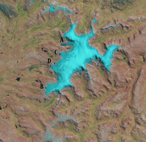 Safuna Glacier (S) is at the northern end of the Cordillera Blanca Range, Peru flowing north from Nevados Pucajirca. Arhuey Glacier (A) is adjacent to Safuna and flows west formerly terminating in Arhuey Lagunacocha impounded by a moraine. Safuna Glacier in 1992 terminated in Laguna Safuna Alta, which is impounded by a moraine dam and has a history of water level fluctuations. Reynolds Geosciences (2003) provides a detailed look at the lake, moraine and associated engineering. The moraine appeared unstable in the 1960’s prompting excavation of a tunnel through the moraine in 1970, which ended up below the lake water level after the lake surface elevation dropped 25 m in late 1970. In 1978 a second tunnel was constructed, that to date remains above the lake waterline and has not been used. The Peruvian Government was early in their proactive engineering to address glacier lake outburst flood hazards (Carey, 2008). In 2002, a rockslide created a wave of at least 80 meters in height (Reynolds Geosciences , 2003), overtopping the moraine and damaging both tunnels but not damaging the moraine. This landslide also filled in the lake reducing depth significantly. Here we examine changes from 1992 to 2017 using Landsat imagery from July of Safuna Glacier (S) and Arhuey Glacier (A). Though glacier outburst floods have capture more attention it is the overall reduction in glacier water runoff that has more impact on local communities (GlacierHub-Angle, 2017).
