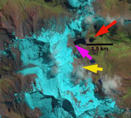 Safuna Glacier (S) and Arhuey Glacier in 1995 and 2015 Landsat images indicating glacier retreat from the 1992 terminus red arrow to the 2017 terminus position yellow arrow. Snowline indicated by purple dots.