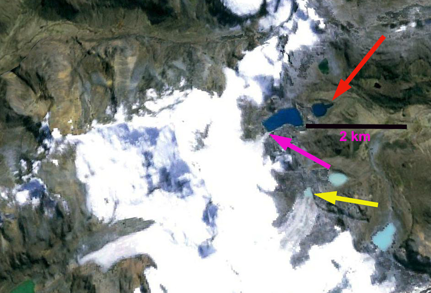 Safuna Glacier, Laguna Safuna Alta and Laguna Safuna Baja (SB), blue arrow recent 2002 landslide scar and yellow arrow 2017 terminus.