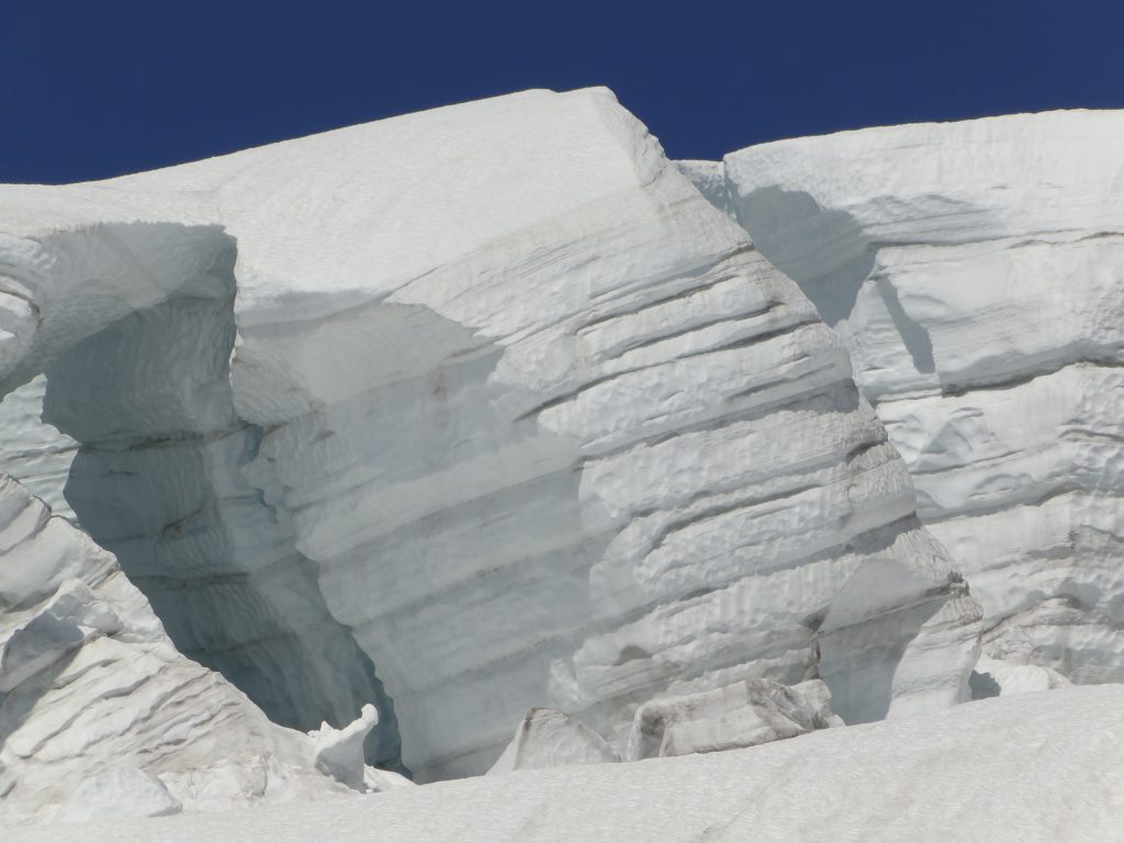 This photograph of an icefall at 2000 m (6700 ft) on the Easton glacier encompasses the wide range of emotions that I felt working on these glaciers this summer. The focal point of the picture is the wound inflicted upon the glacier by our changing climate. Bedrock and sediment creep through the gaping wound in the lowest icefall of the Easton, the opening visible for the first time in the project’s 42-year history. The place also holds a beauty, a sense of majesty that cannot be diminished by the tragic context of our work. The seracs at the top of the scene lean at impossible angles, destined to crash down onto the slope below, piercing the quiet of the snowy expanse in dramatic fashion. The dark annual layers in the glacier speak to the age of the ice, flowing down the flank of Mt. Baker over decades. The landscape has been a facet of my life for the past few years, as it falls upon the Easton Glacier route to the mountain’s summit. The icefall has always drawn me in as I pass, sparking a profound sense of wonder. It makes me deeply sad to see the beauty of such special places diminished, sad in a way that little else does. Over the past few years, I’ve come to like visiting these places to visiting an elderly loved one. While time may change them and even take them away from us, their beauty and meaning to me will hold true.-Emmett Elsom