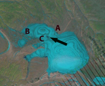 In 2000 the glacier has a well established glacier runoff stream at yellow arrow. Point 1 is a nunatak amidst a peripheral segment of the ice cap. Point 2 is an area of bedrock separated by a narrow section of ice cap from adjacent bedrock. Point 3 and 4 are locations where the ice cap is thick enough to spillover in to an adjacent basin. There is little visible snowpack on the ice cap, but a significant area of azure blue indicates snow/firnpack (R) that is saturated with meltwater, some of which will refreeze. There are zones of superimposed ice development(S) where meltwater is refreezing on top of the cold surface ice. In 2018 there an area of unsaturated snowpack, white area, and saturated snow/firnpack (R) azure blue and areas of superimposed ice development (S).