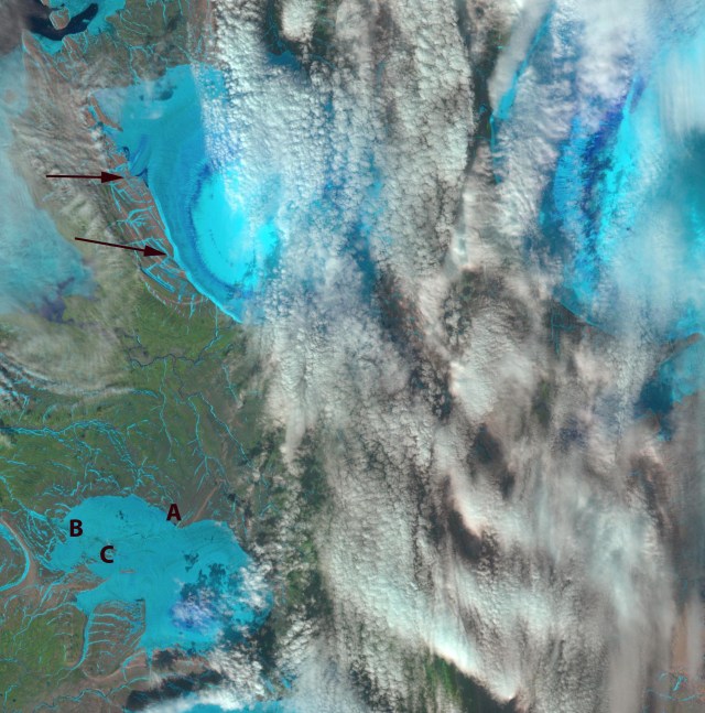 The lack of retained snowcover in 2020 was also seen at Hochstetter Ice Cap in Franz Josef Land. In both cases the high summer temperatures led to more meltwater, and the lack of snowpack to retain leads to more escaping the system. Bassford et al (2006) describe this process “Intense surface melting in the accumulation zone during warm summers prevents the buildup of a thick firn layer by rapid transformation of firn to ice through refreezing and by removing