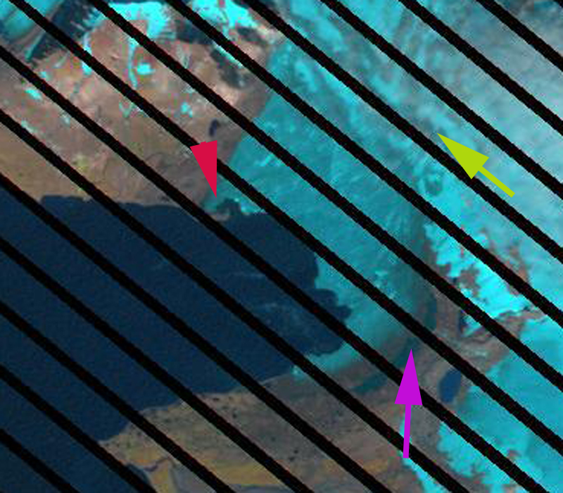2013 Landsat images. Note the snowpack limited to the very top of the glacier, purple dots