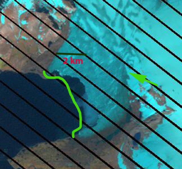 Most of the attention on Svalbard glaciers goes to the larger tidewater glaciers, which collectively having been losing volume rapidly. Belopolskijbreen in Sorkappland near the southern tip of Svalbard a land based glacier that we examine here using Landsat images from 1990 to 2014. The glacier is adjacent to Olsokbreen a rapidly retreating tidewater glacier. In 1990 and in the TopoSvalbard maps indicate the glacier terminating in proglacial lakes A and B. The snowline is restricted to the very top of the glacier. With limited retained snowpack anywhere, the glacier will thin and retreat significantly. In the middle of the glacier near the red arrow is a bedrock ridge that 700 m into the glacier. By 2014 the bedrock ridge has extended to the yellow arrow, an additional 700 m. The glacier has retreated 500 m from Lake A and 650 m from Lake B. The retreat of approximately 500 m across a 4 km wide glacier front plus the expansion of bedrock in the middle, represents more than 2 square kilometers of area lost. This retreat will continues as the snowline has been limited to the very top of the glacier in 2013, 2014 and 2015. The 2013 Landsat image below indicates the snowline with purple dots. The snowline is above 375 m with the top of the glacier at just over 400 m. The glacier has 10% snowcover retained at a maximum, the minimum needed for equilibrium is 50%.