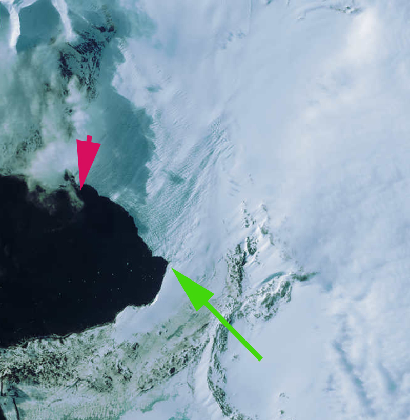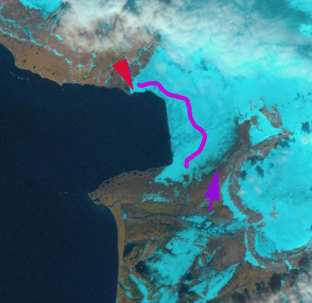 Belopolskijbreen comparison in 1990 and 2014 Landsat images. Red arrow is the 1990 terminus location, yellow the 2014 extent of the a bedrock ridge separating the two lobes of the glacier, and purple arrow an area of thinning at the head of the glacier.