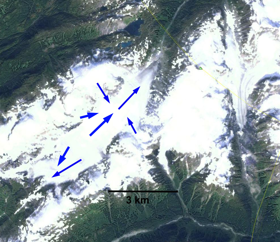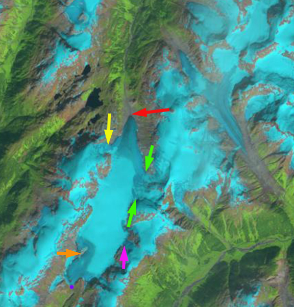 Chickamin Glacier, Alaska in 1994 and 2013 Landsat images indicating the 3.5 retreat and associated lake expansion. Red arrow is 1985 terminus location, yellow arrow is the 2018 terminus location, pink arrow is former junction area with Through Glacier. The purple dots indicate the snowline. Point 1 and 2 are locations of bedrock expansion above the equilibrium line altitude.