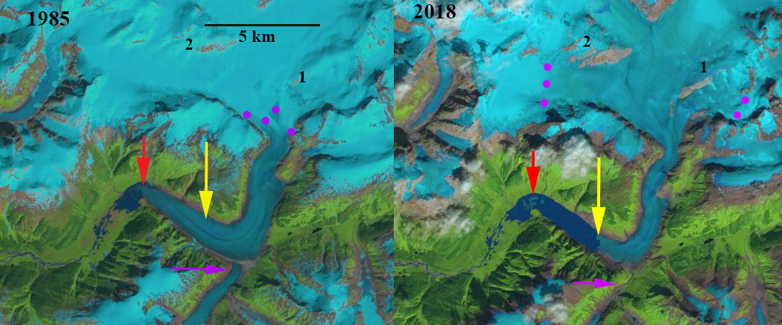Chickamin Glacier, Alaska in 1985 and 2018 Landsat images indicating the 3.5 km retreat and associated lake expansion. Red arrow is 1985 terminus location, yellow arrow is the 2018 terminus location, pink arrow is former junction area with Through Glacier. The purple dots indicate the snowline. Point 1 and 2 are locations of bedrock expansion above the equilibrium line altitude.