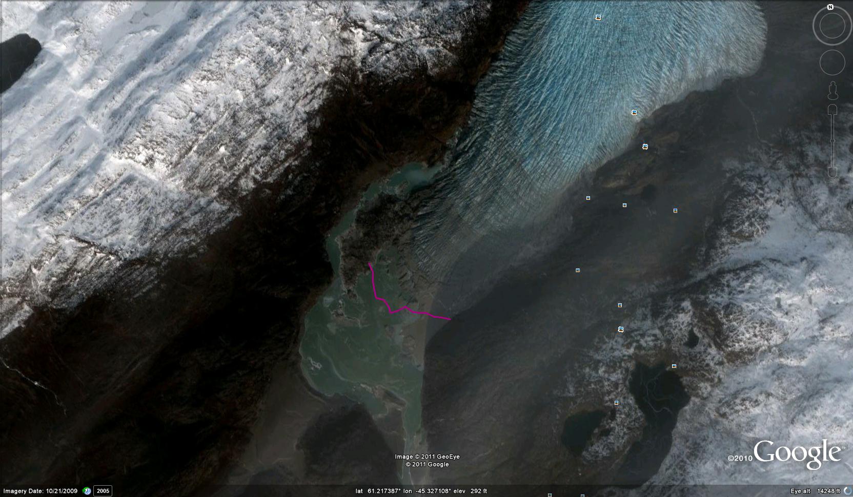 Greenland tidewater outlet glaciers in this region have experienced substantial retreat since 1990, Weidick et al (2012) and Howat and Eddy (2011). Murray et al (2015) examined 199 tidewater glaciers in Greenland and noted significant retreat of 188 of them. Apostelens Glacier was not one of these, and soon will not be a tidewater glacier to be included in the list.