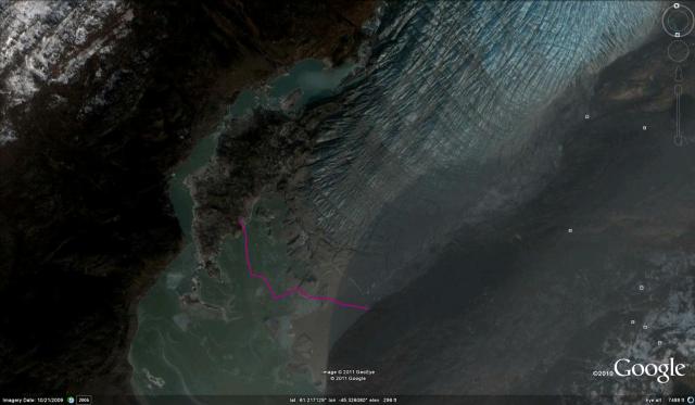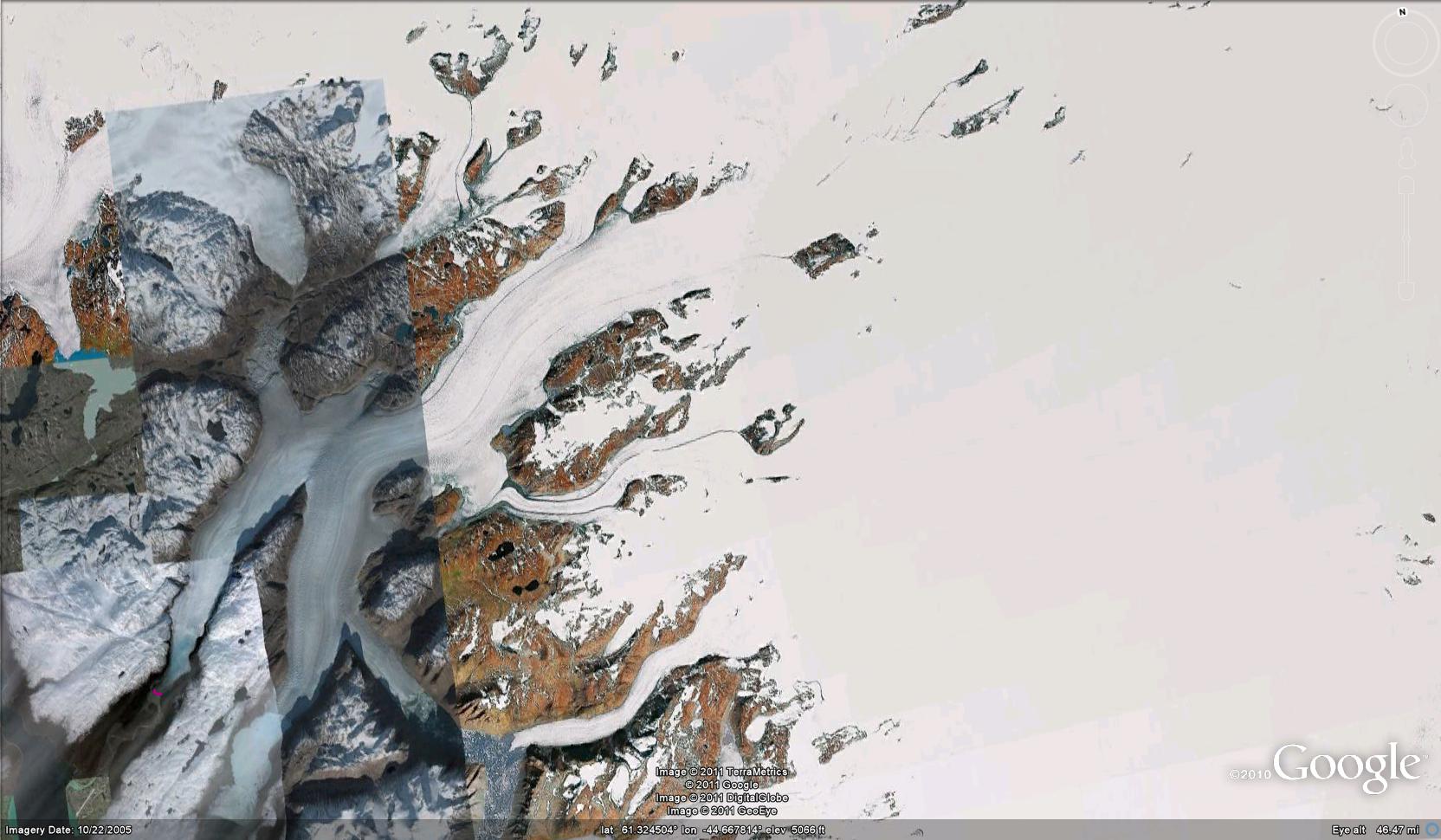 Apostelens Glacier in Norrearm Fjord Google Earth comparison from 2004 and 2012. Red arrows are the 2004 terminus location, and yellow arrows the 2012 terminus location. Note ogives in 2004 and loss of them in 2012.