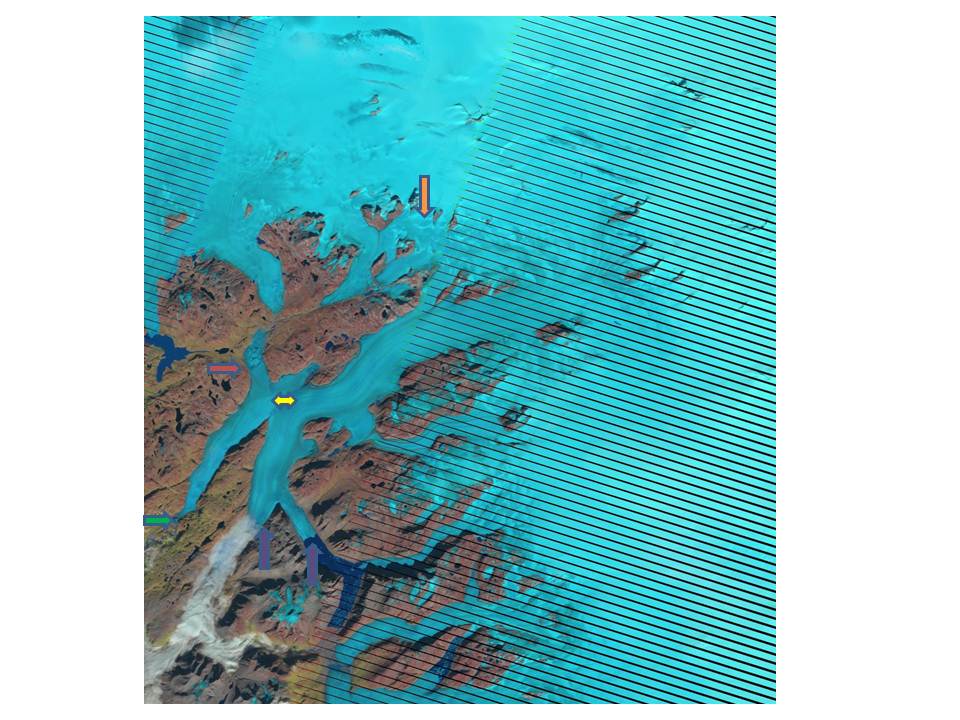 Apostelens Glacier in Norrearm Fjord Landsat comparison from 1999 to 2016. Red arrows are the 1999 terminus location, yellow arrows the 2016 terminus location and purple arrows indicate an expanding bedrock ridge.