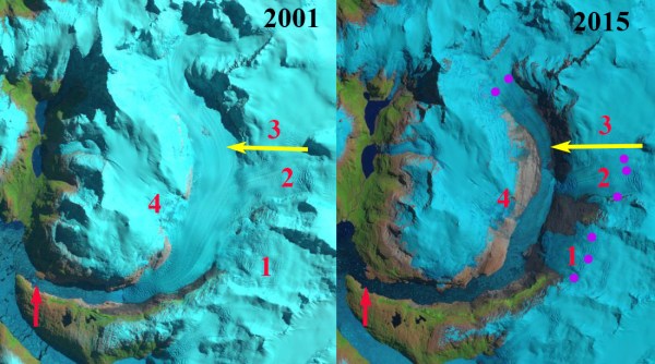 Bernardo Glacier in Landsat images from 2003 and 2015 illustrating retreat at the southern (S), middle (M) and northern (N) terminus respectively. Lake expansion and then drainage occurs at S. Red arrows are 1986 terminus locations, yellow arrows are 2021 terminus locations.