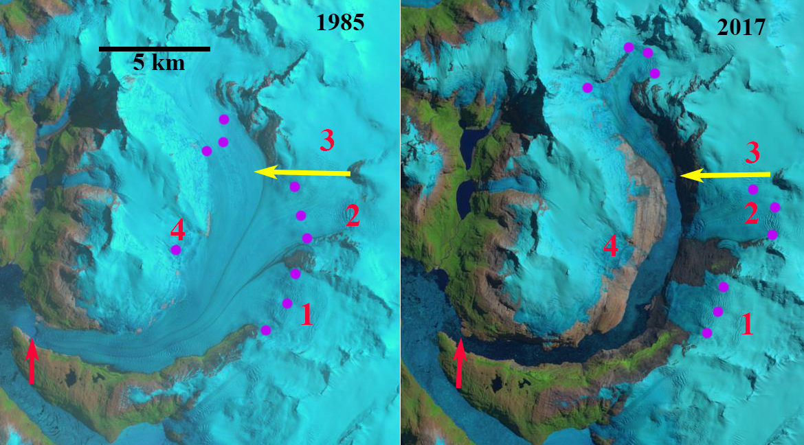 Bernardo Glacier is an outlet glacier on the west side of the Southern Patagonia Icefield (SPI) that currently ends in an expanding proglacial lake system, with three primary termini. Here we examine changes from 1986 to 2021 using Landsat images. Davies and Glasser (2012) indicate that over the last century the most rapid retreat was from 2000 to 2011. Willis et a (2012) note a thinning rate of 3.4 meters per year during this period of the Bernardo Glacier region, which drives the retreat. Mouginot and Rignot (2014) illustrate that velocity remains above 200 m/year from the terminus to the accumulation zone on Bernardo Glacier. Eñaut Izagirre visited the glacier in 2019 and provided images of the middle terminus of Bernardo Glacier, below.