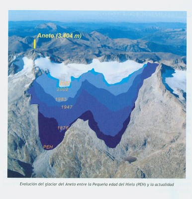 Aneto Glacier in the Pyrenees of Spain is listed as its largest glacier in a 1984 inventory. In 1984 the glacier had an area of 1.32 square kilometers and a length of 1.6 km (Serrat and Ventura, 2005). The glacier is located on the northeast side of Aneto Peak. The glacier is just a few kilometers from the rapidly retreating Maladeta Glacier. SOER (2010) indicate that more than 80% of the glacier area on the Maladeta-Aneto Massif was lost between 1984 and 2007.