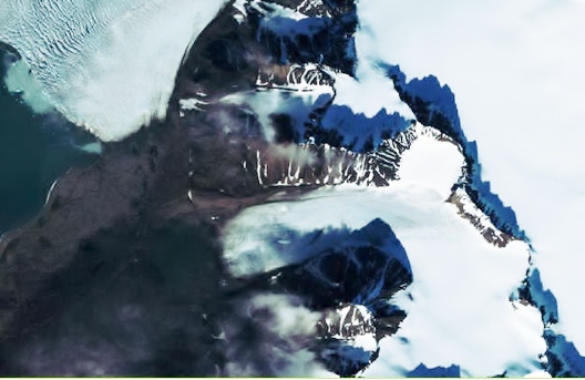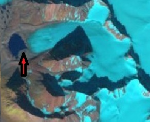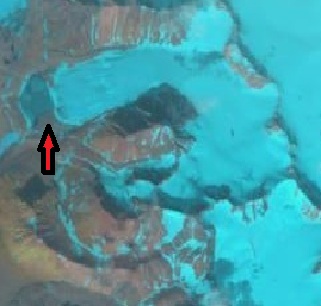Arnesenbreen in Landsat image from6/3/2018 indicating zone of most extensive crevassing.