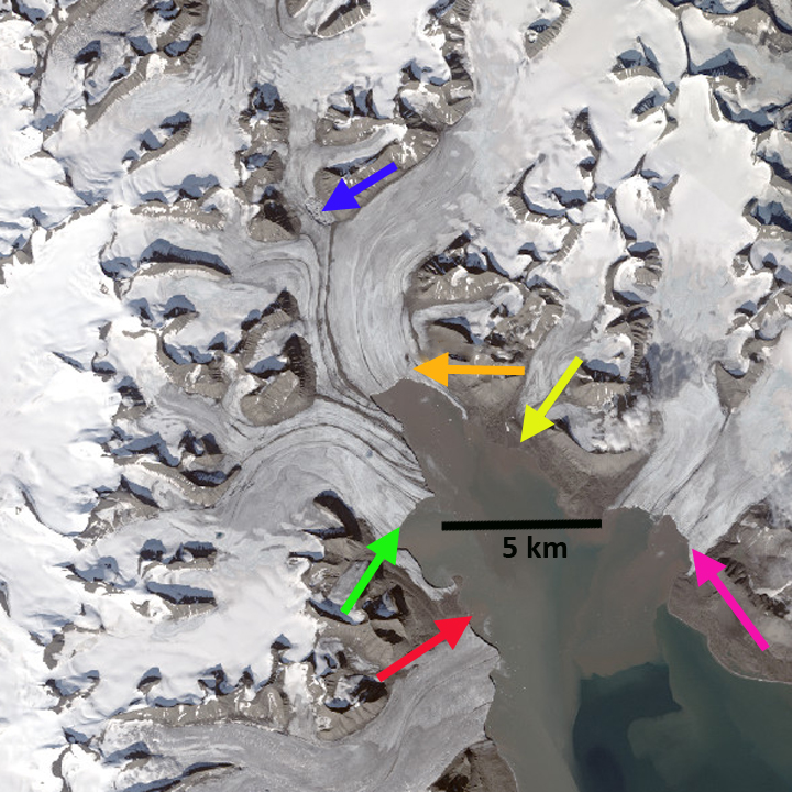 In 1990 Arnesenbreen-Bereznikovbreen had a shared 5 km long tidewater front. The transient snowline in this July image is at 200 m. The glacier terminus reach is not extensively crevassed. In 2002 the two glaciers are separating at Point 1 each having retreated ~400-500 m, crevassing remains limited. The transient snowline in 2002 is at 300 m. By 2014, Arsenenbreen has retreated 1400 m since 1990 and crevassing remains limited. The transient snowline is at 300 m, though there is a saturated zone of snowpack above this line, that suggests extensive melt up to 500 m. In 2018 the surge crevassing was most apparent in the April image of Holmund (2018). On June 30 the extensive crevassing is still evident, particularly in the 200-250 m elevation band near Point 2, but is reduced from April in the terminus zone near Point 1. By July 21 the image indicates much reduced calving in the terminus zone of the glacier. Sevestre et al (2018) note a pattern of terminus initiated surge progression, “Upward migration of the surge coincided with stepwise expansion of the crevasse field.” This is exactly what is seen at Arnesenbreen, we are also seeing the surge terminating with calving reduction at the terminus first. The short lived nature of the surge indicates the limited impact on the longer term retreat. The surge did not lead to a reconnection with Bereznikovbreen. Bereznikovbreen has retreated 700-800 m since 1990 and Arnesenbreen has retreated ~1500 m from 1990-2018.