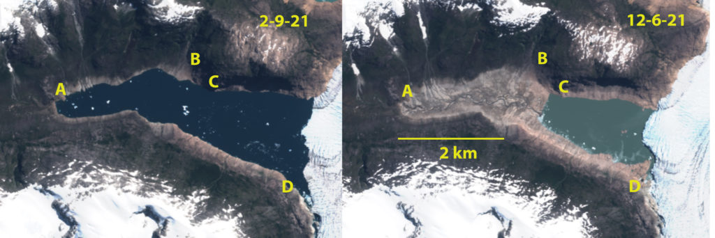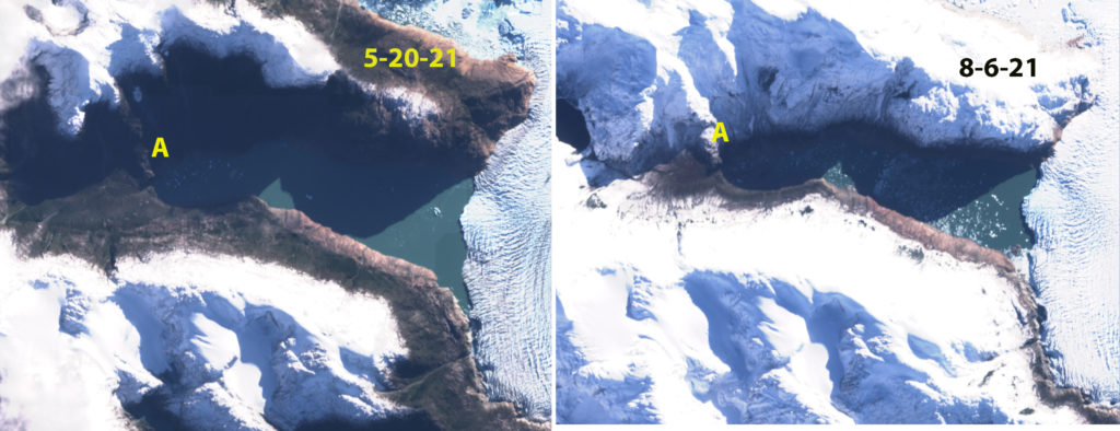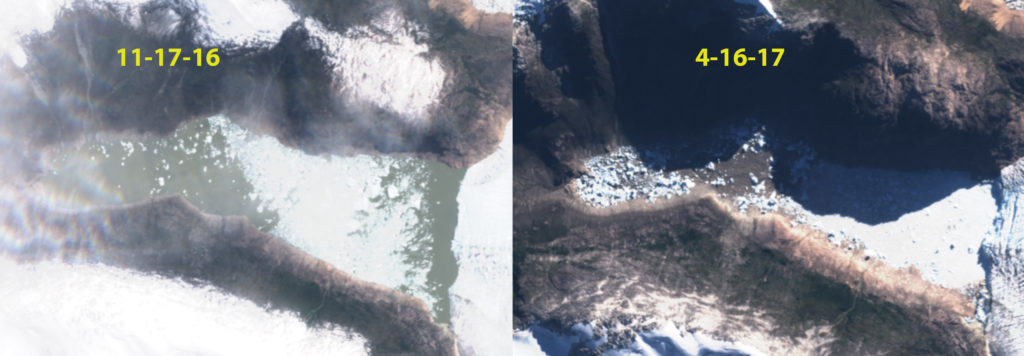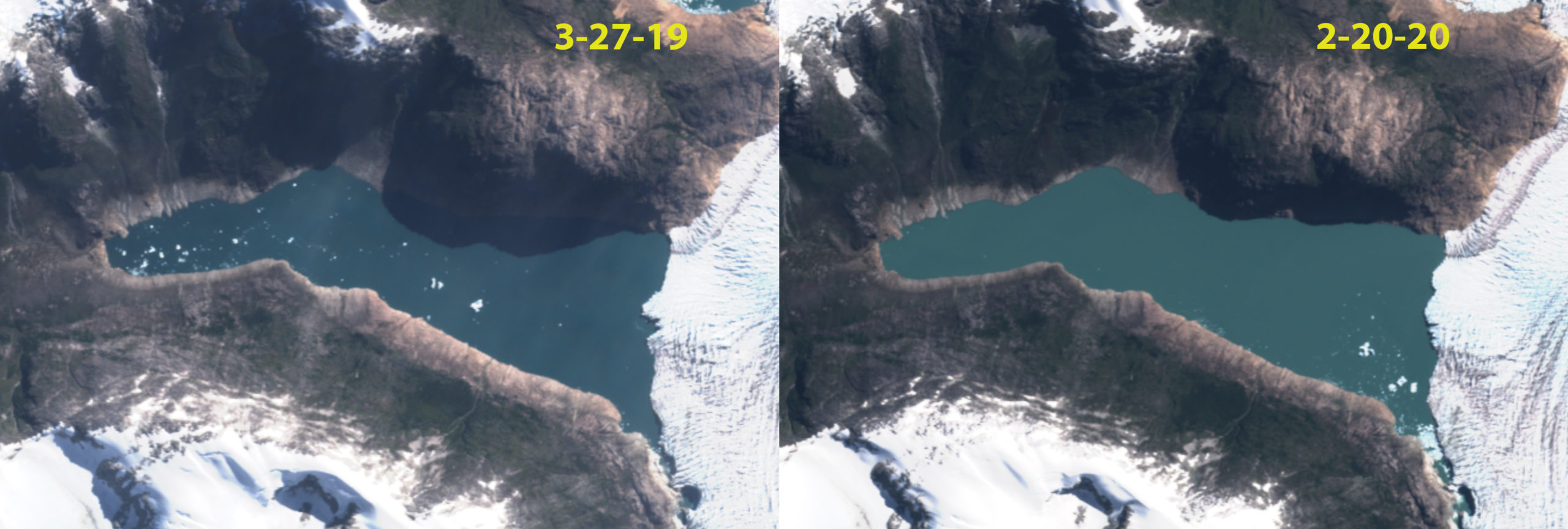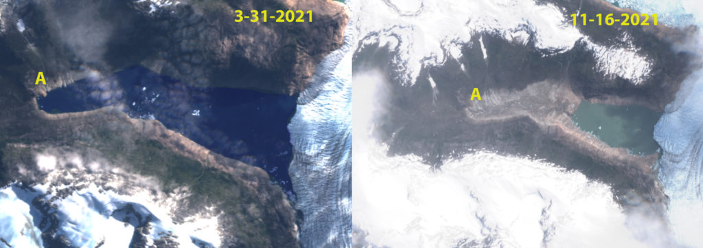 Reichert Glacier is an outlet glacier of the Northern Patagonia Icefied that retreated 6.7 km from 1987-2015. Then was nearly stationary to 2023, with a 750 m retreat from 2022 to 2024 and an active calving period spring 2024 note new icebergs in the lake. The terminus is retreating into a narrower fjord reach,, with a pinch point 1.5 km behind the terminus, that should provide short term stability.