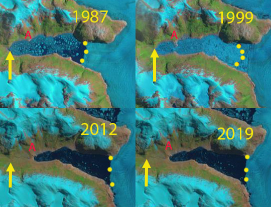 Steffen Glacier is the largest south flowing outlet of the 4000 km2 Northern Patagonia Icefield (NPI). On December Dec. 6, 2023 the terminus tongue has a narrow unsupported section that appears poised to calve (C). By Dec. 26, 2023 the glacier has calved berg C (0.4km2 ), joining other large bergs remaining from previous years D, E and F. Two more pieces A and B appear poised to calve. By Feb. 9 2024 berg B had calved, and by Feb. 24 berg A had calved, together they are 0.3 km2. On April 14 two more large bergs X and Y have calved from the terminus. Berg X is the largest of the year at 0.6 km2, berg Y is 0.2 km2 . Terminus retreat from Dec. 2023-April 2024 is 1.5 km. In noted in April that the terminus tongue was narrow and unsupported (Pelto, 2024) , indicating that more large icebergs should be expected in the 2025 summer season, and in December this happened releasing several icebergs Z1, Z2 and Z3 with a combined area of 3 km2 The glacier retreated 2.6 km as a result of this calving event.