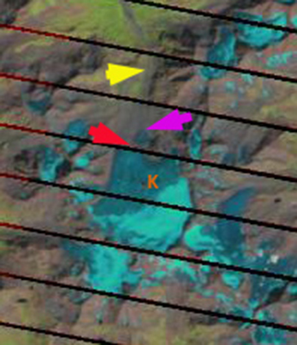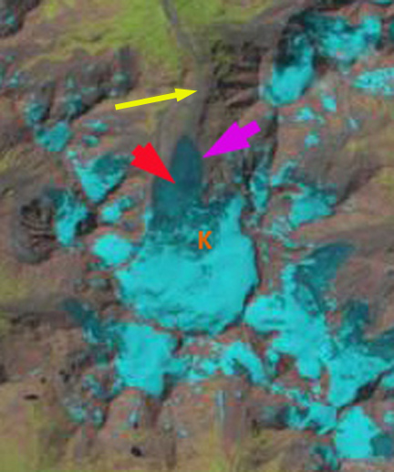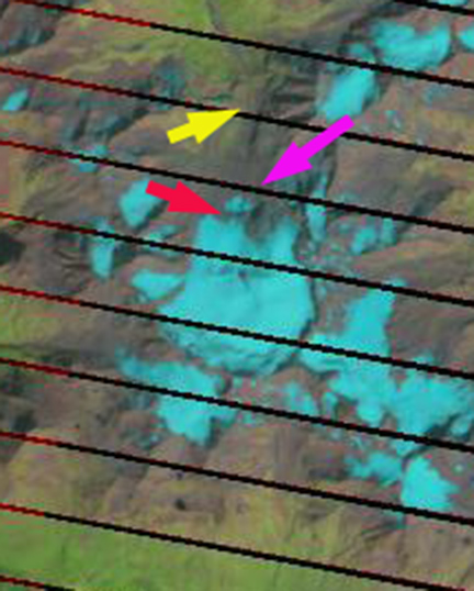 Sulztalferner in Landsat images from 1990 and 2017. Red arrow is the 1990 terminus, yellow arrow the 2017 terminus, purple dots the snowline and the green arrow an area of emergent bedrock amidst the glacier.