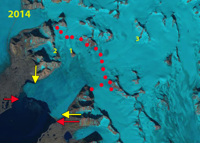 Freemanbreen in 1990 and 2022 Landsat images. Both are years with limited retained snowcover (S) and some area of retained firn (F). The glacier has retreated from a new island that had formed at Point D. At Point A-C glacier melt and resultant thinning has exposed and expanded bedrock areas.