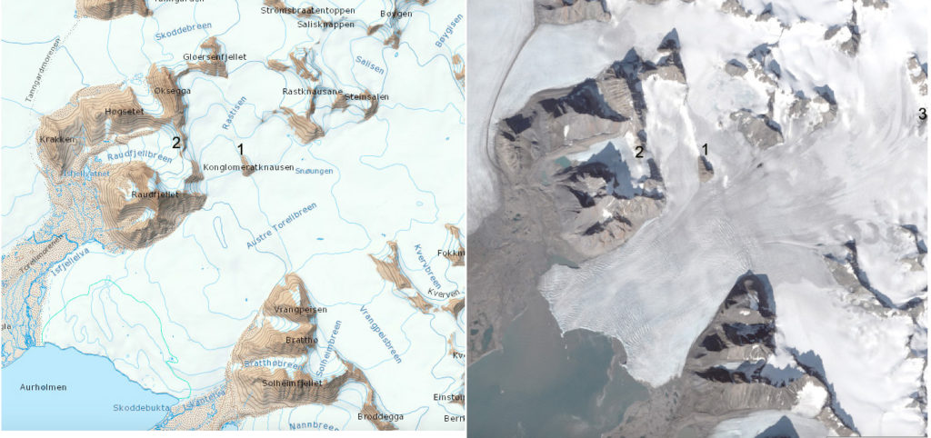 Left image aerial photograph from TopoSvalbard, at right Sentinel 2 image from 2022. Island indicated by arrow.