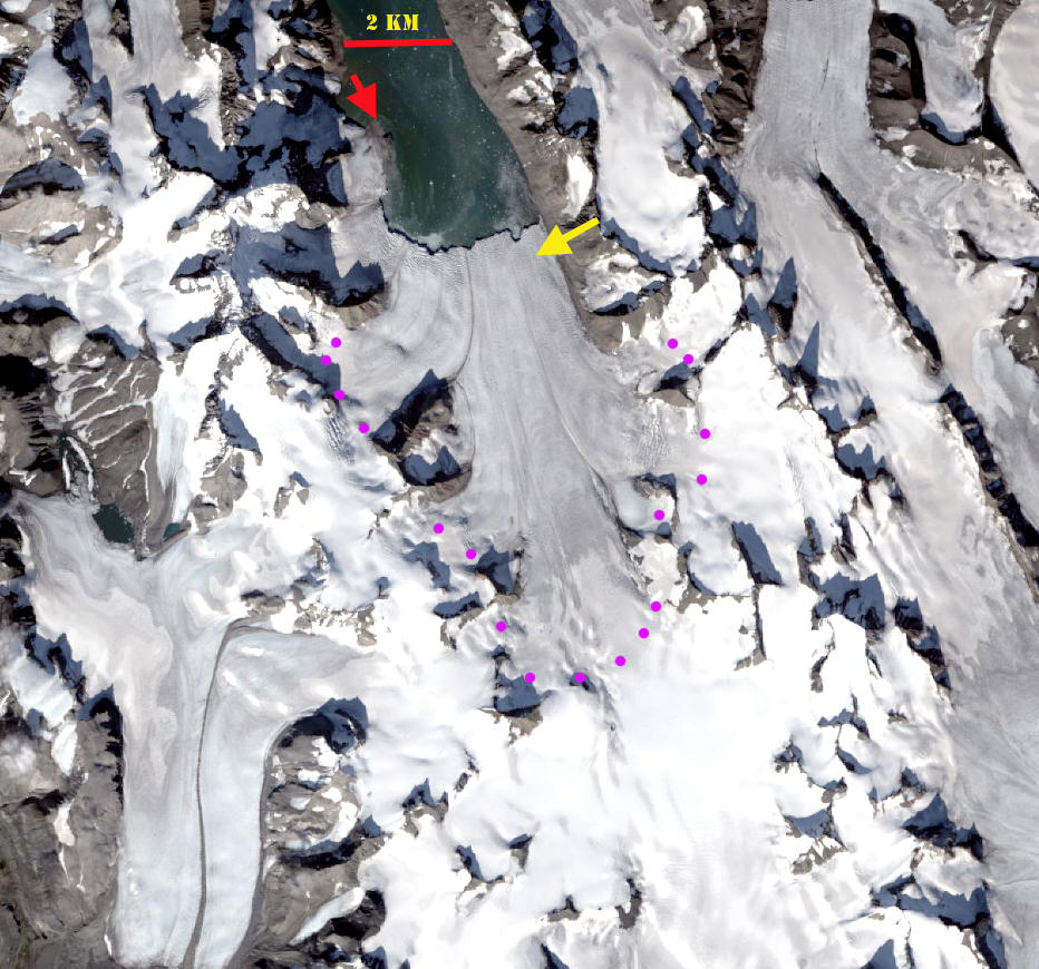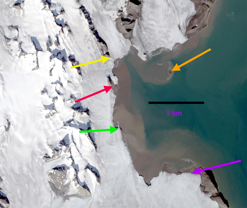 Response of Orasbreen (O), Glopeken (G) and Holmstrombreen (H) to climate change as indicated by 1995 and 2019 Landsat images. Red arrow is 1995 terminus, yellow arrow 2019 terminus, pink arrows a deepening supraglacial stream channel and purple dots the snowline.