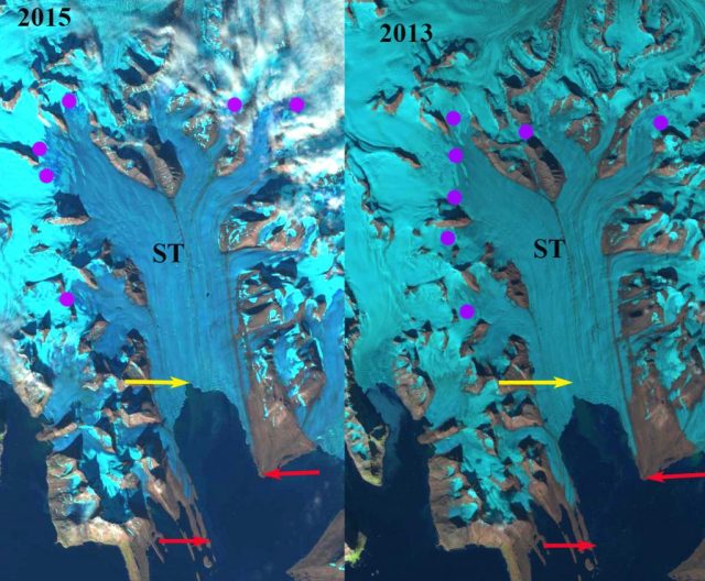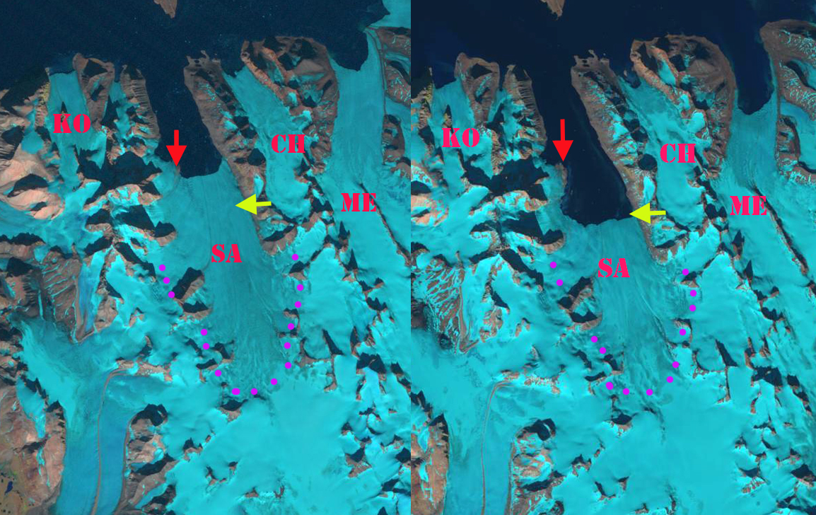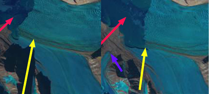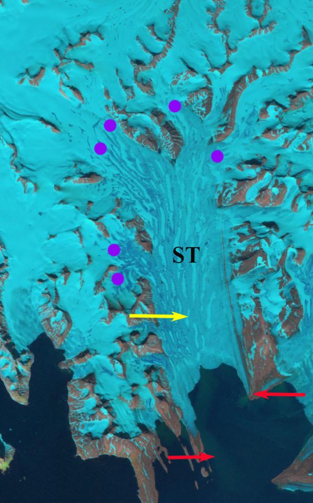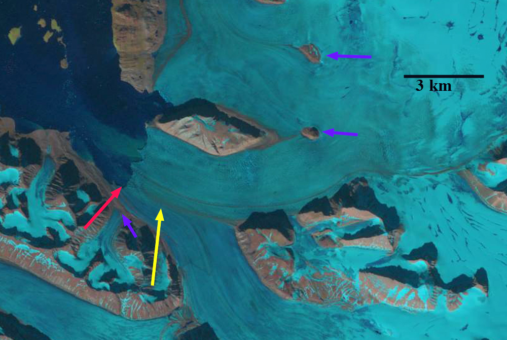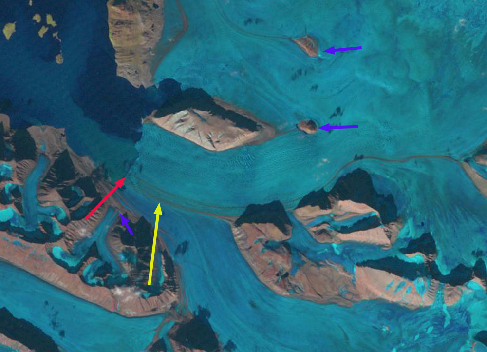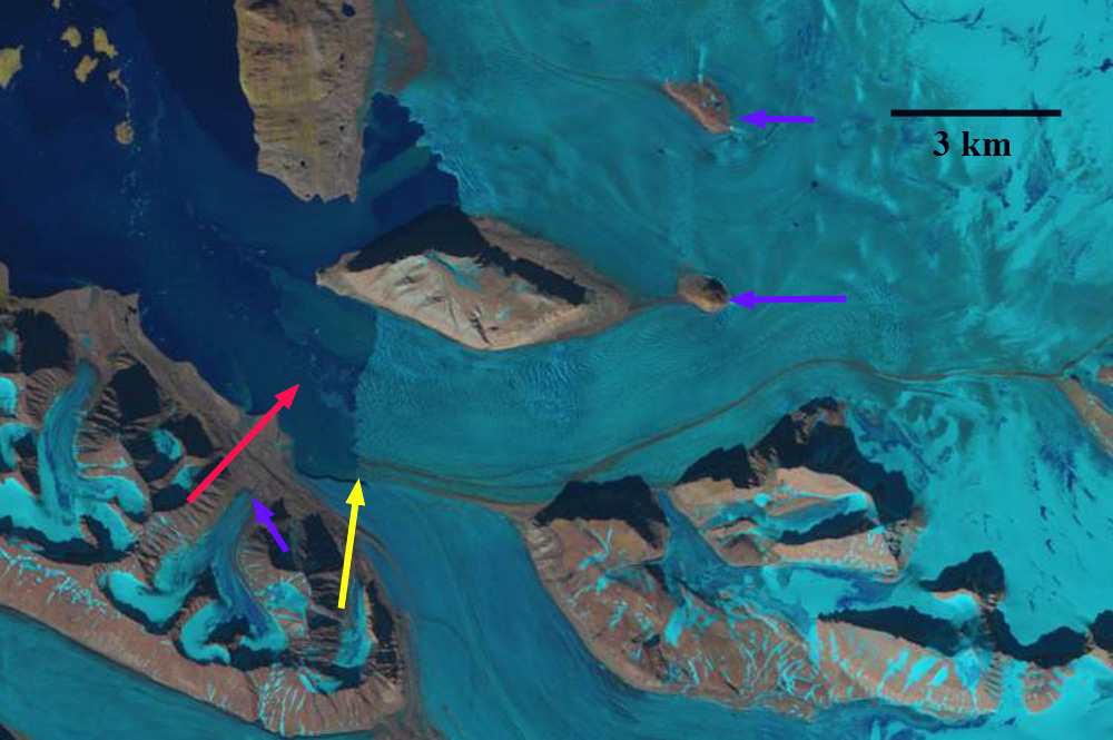 Response of Orasbreen (O), Glopeken (G) and Holmstrombreen (H) to climate change as indicated by 1995 and 2019 Landsat images. Red arrow is 2000 terminus, yellow arrow 2017 terminus, pink arrows a deepening supraglacial stream channel and purple dots the snowline.