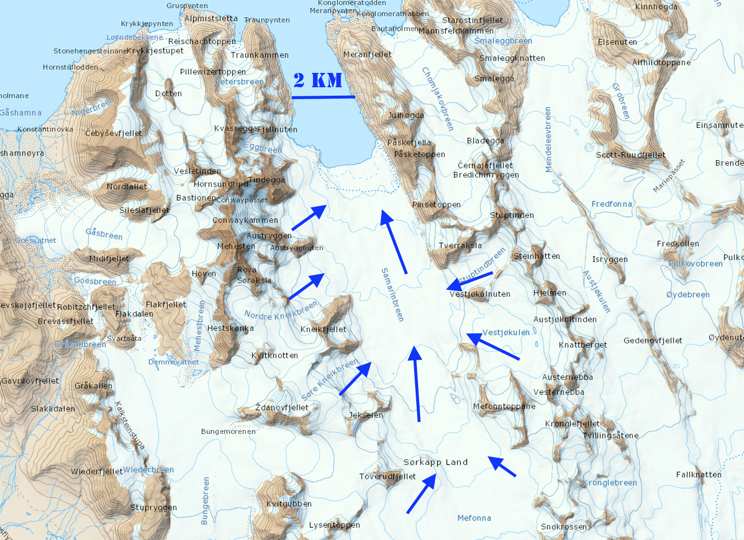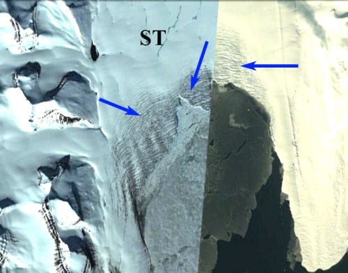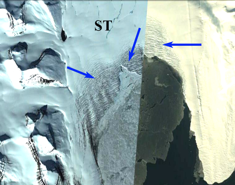 TopoSvalbard map and image of the Orsabreen terminus area and expansion of Trebrevatnet. Light blue arrows indicate ice cored medial moraine, light green arrows indicate rifts, and purple arrows a deep supraglacial channel.