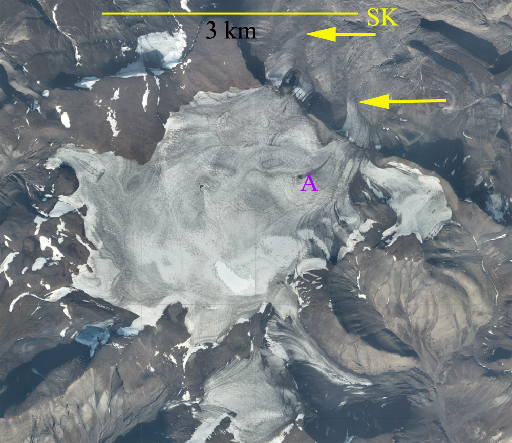 Orsabreen terminates in an expansing prolgacial lake, Trebrevatnet, that is shared with a glacier it has separated from Holmstrombreen. The glacier shares an accumulation zone with Kronebreen, a glacier that is experiencing rapid retreat, and is fast flowing (How et al 2017). The high discharge of Kronebreen indicates a high volume of accumulation above 650 m in the shared accumulation zone, the Holtedahlfonna. Nuth et al (2010) from 1965-2007 reported the mean mass balance of Svalbard glaciers, excluding Austfonna and Kvitøya, as −0.36 m yr−1 . They noted that Orsabreen had less volume loss −0.24 m yr−1 and did have an increase at higher elevation. Ruppel et al (2017) observed annual accumulation of 0.9 m w.e. at 1100 m on Holtedahlfonna from 2005-2015. Trebrevatnet expands both through glacier retreat and the melt out of ice cored moraine that comprises much of its margin, they observed 0.9 m of annual melt of the dead ice moraine areas (Schomacker and Kjaer, 2007).