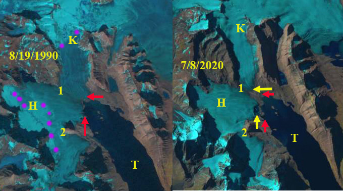 Øydebreen (O) and Mendeleevbreen (M) in 1990 and 2020 Landsat images. Red arrow is the 1990/2002 terminus, yellow arrow the 2020 terminus and purple dots the snowline.
