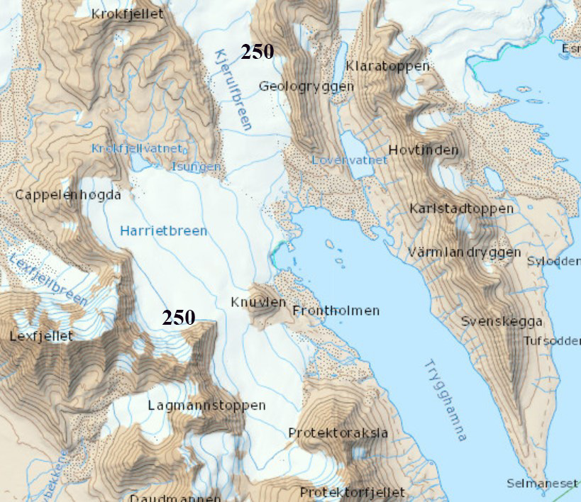 TopoSvalbard map of the region with ice flow indicated by blue arrows.