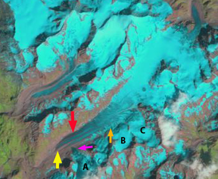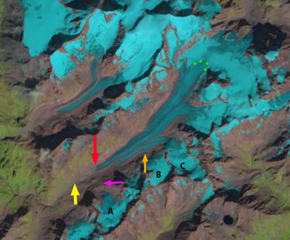 In 1985 the glacier terminates at the yellow arrow, with tributaries A,B & C all joining the main glacier. The snowline is at 2800 m, green dots. In 1988 the snowline extends to the divide with Bas Glacier d’Arolla at 3050 m. In 1999 the snowline also extends to the divide with Glacier d’Arolla. Tributary A no longer connects to the glacier, pink arrow, and the terminus has retreated 300 m.