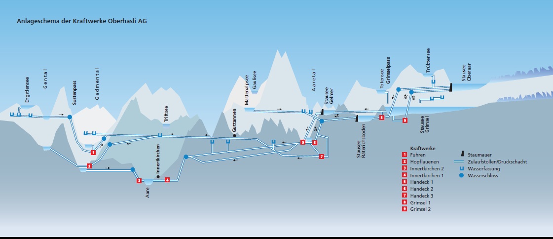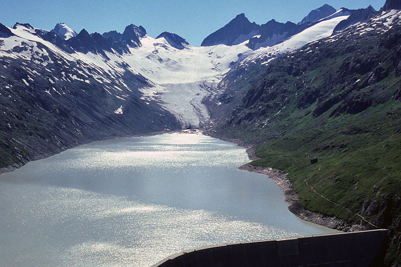 Water from glacier melt is channelled to the Robiei-Zött reservoirs and hydro plants, generating enough electricity for a city. The Cavagnoli and Naret reservoirs at 2310 m feed the Robiei power station, situated 400 m below. The Robiei power station is also capable of pumping the water from the Robiei-Zött up to the higher Cavagnoli-Naret reservoirs.