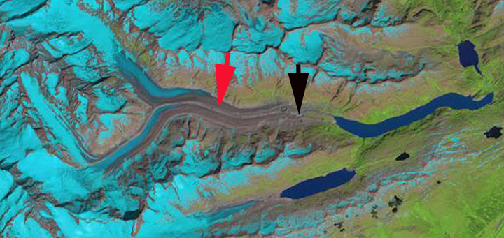 Basodino Glacier in August and September of 2016 illustrating the upward shift of the snowline in the 15 days between the Landsat (left) and Sentinel (right) image. purple dots mark snowline.