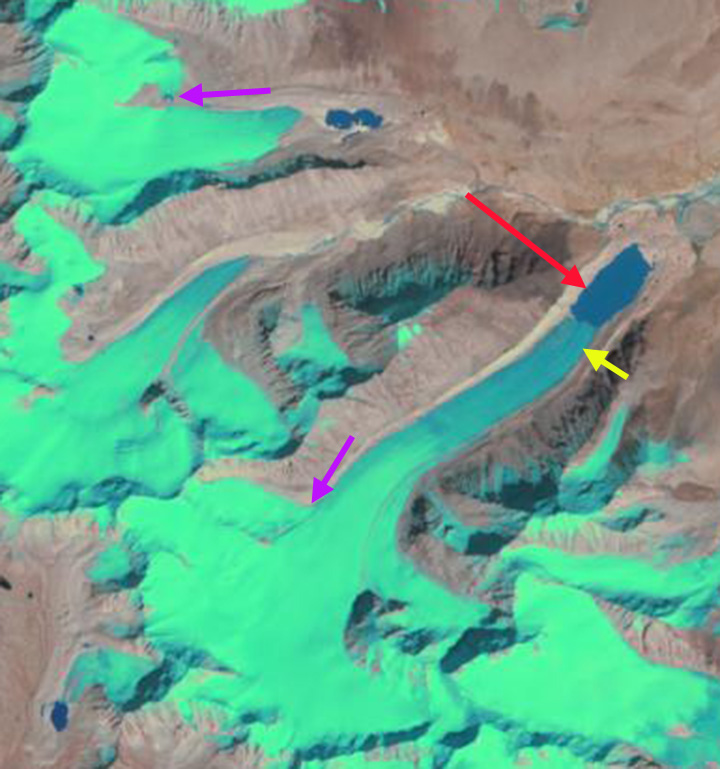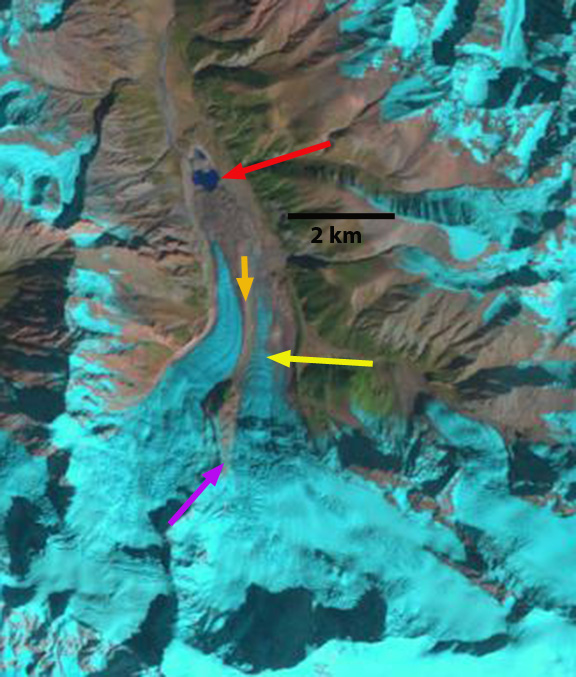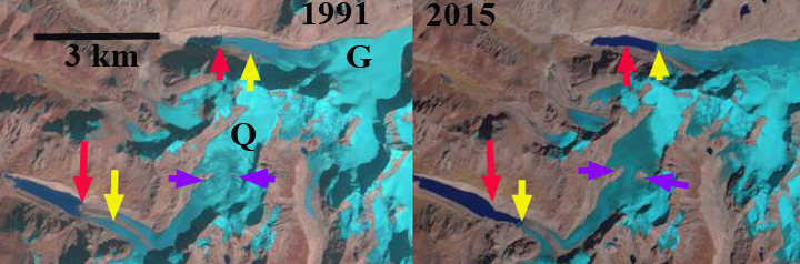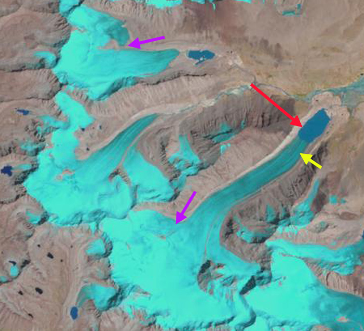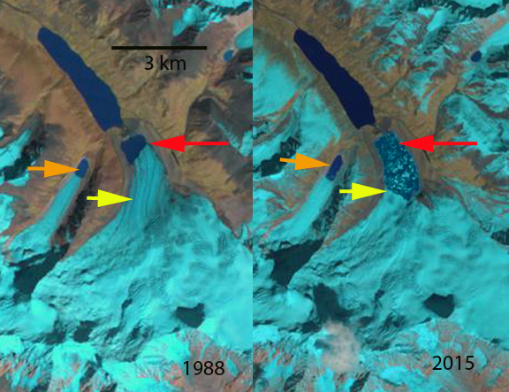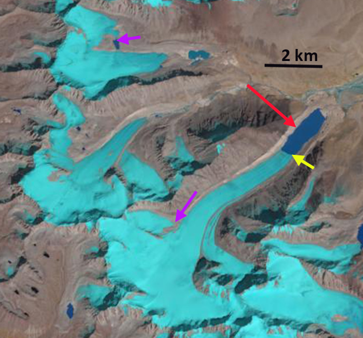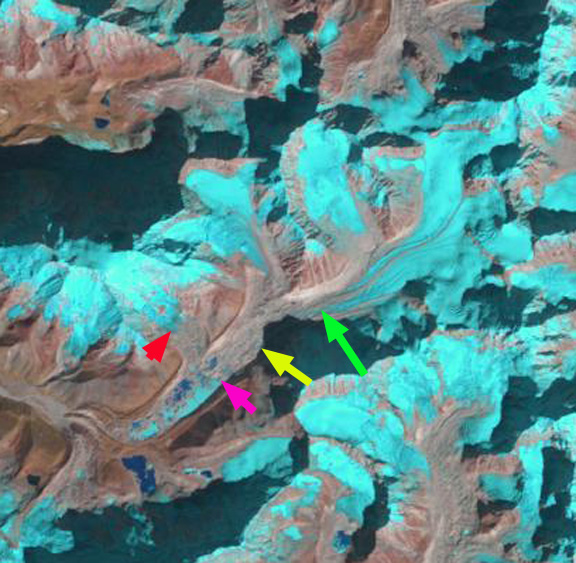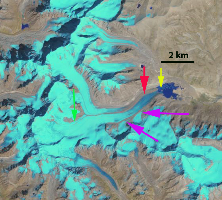 Chako Glacier, Tibet in Landsat images from 1994 and 2016. Red arrow indicates 1991 terminus, yellow arrow 2017 terminus, purple tributary glacier connection and orange arrow nearby icecap.