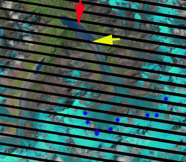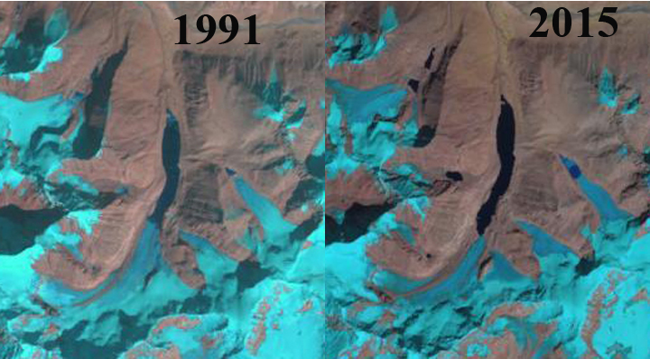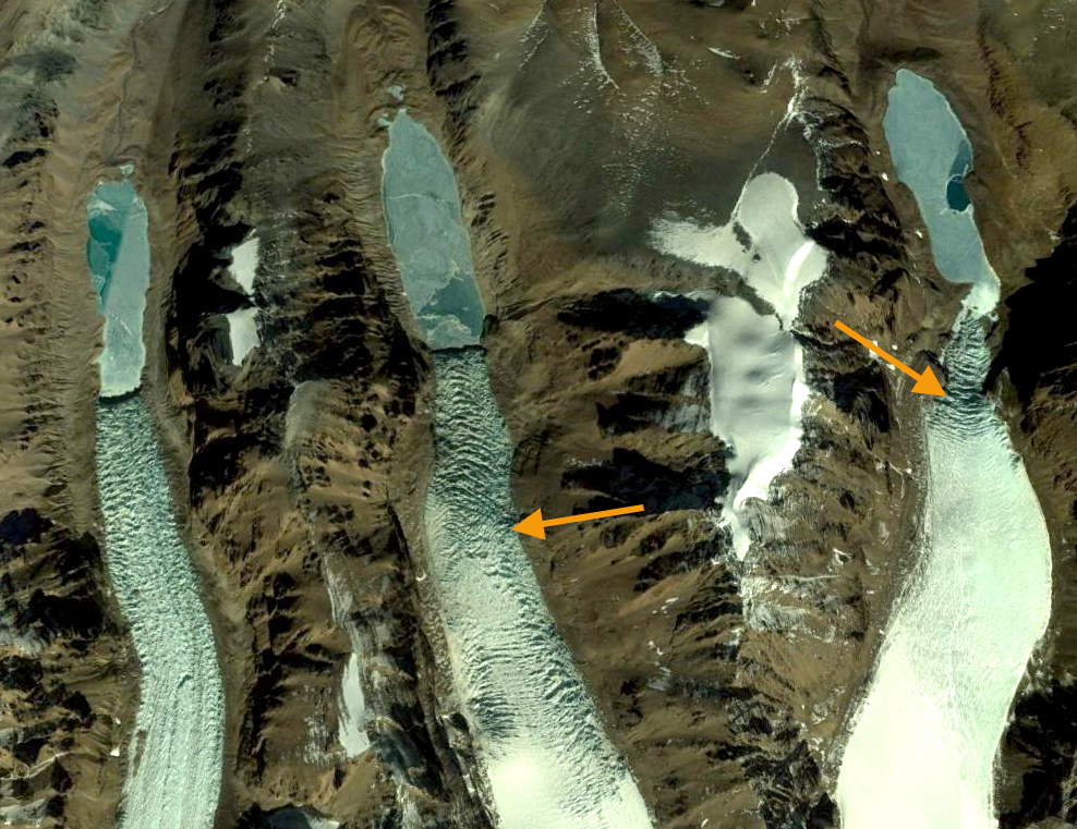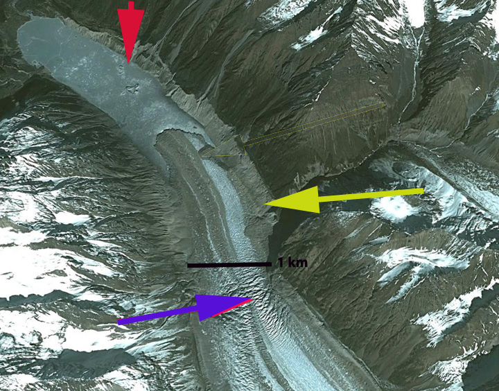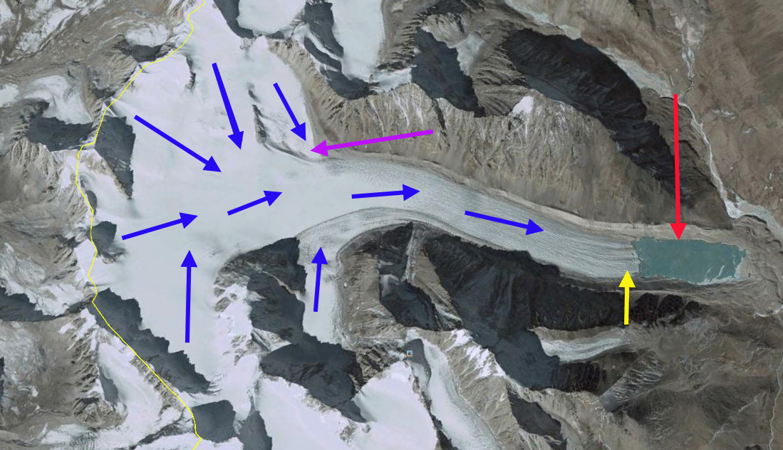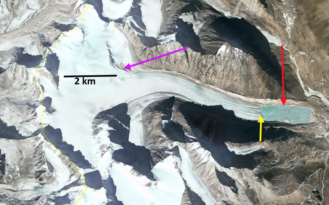 Chako Glacier, Tibet in Landsat images from 1994 and 2016. Red arrow indicates 1991 terminus, yellow arrow 2017 terminus, purple tributary glacier connection and orange arrow nearby icecap.