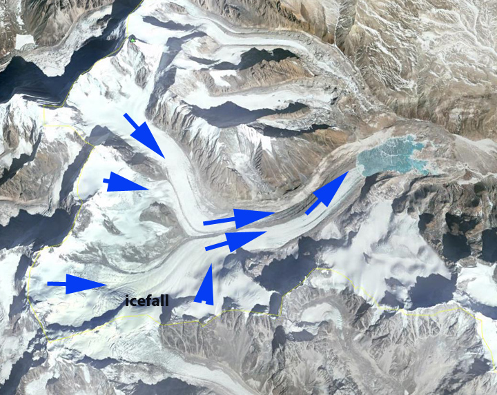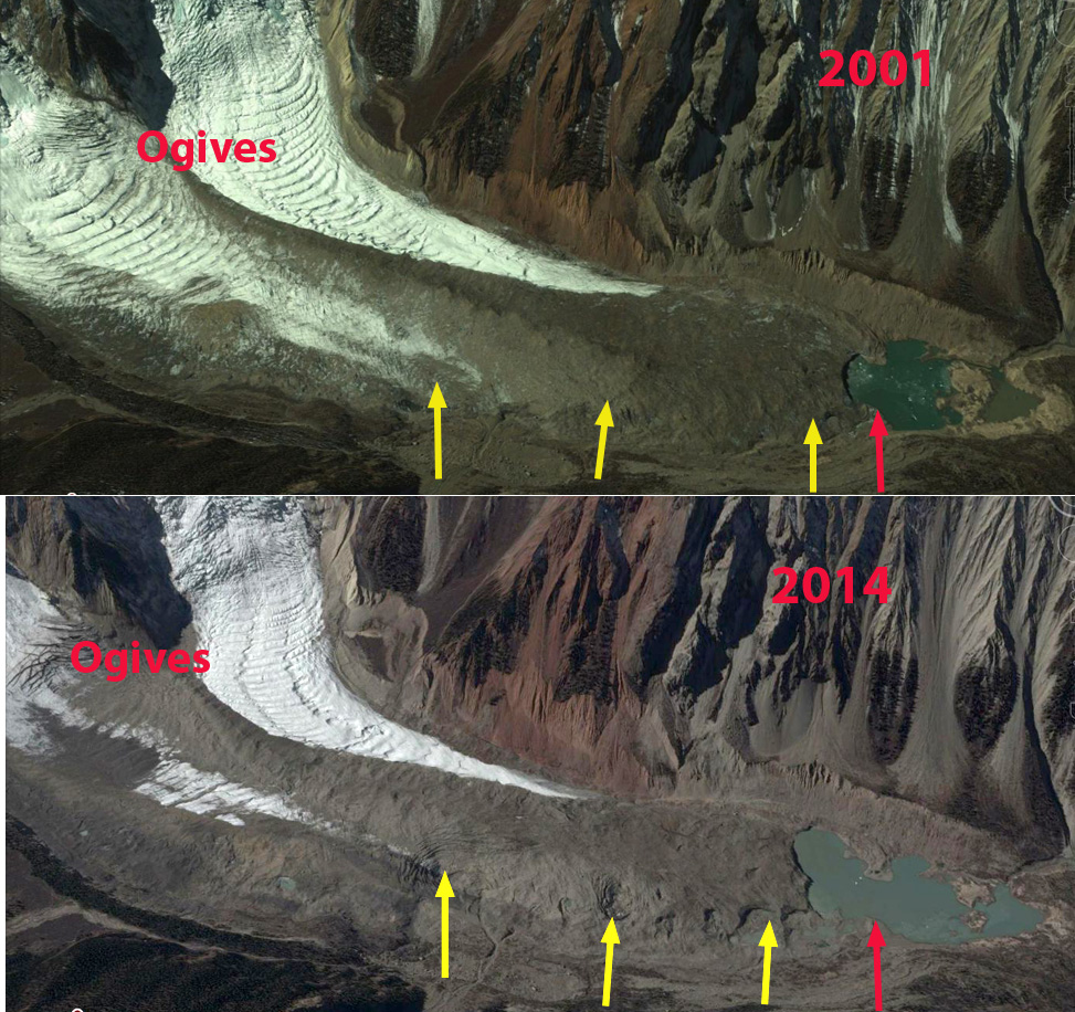 Google Earth image of Chako Galcier terminus in 2005 and 2017. Note difference in crevassing. red arrow 2005 terminus and yellow arrow 2017 terminus.