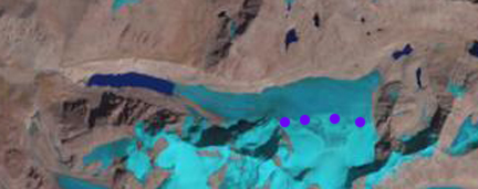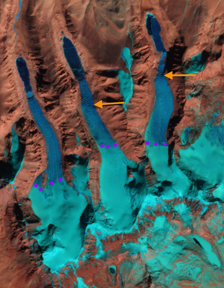 Chako Glacier, Tibet in Landsat images from 1991, 2001 and 2017. Red arrow indicates 1991 terminus, yellow arrow 2017 terminus, purple tributary glacier connection and orange arrow nearby icecap.