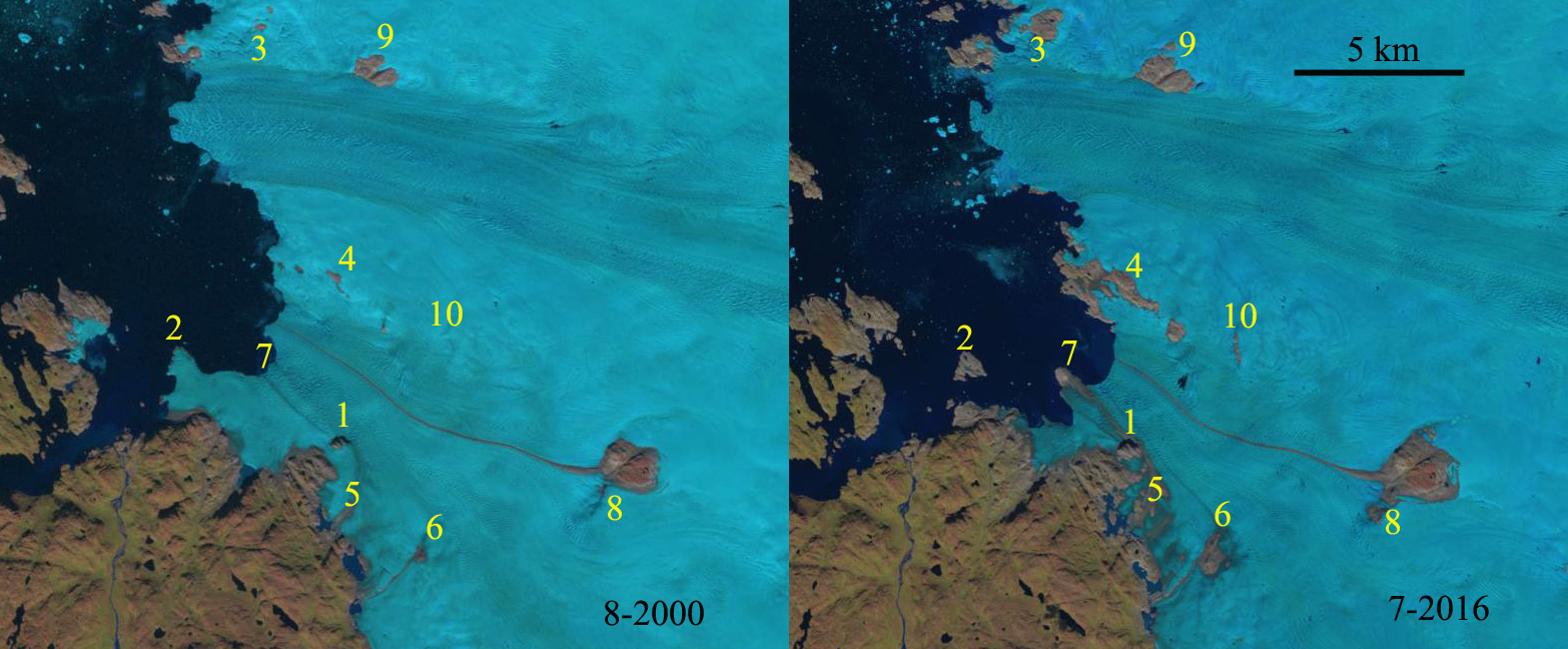 Here we examine the changes from 2000 to 2016 at ten locations near the front of the southern most of the main outlets of Upernavik Glacier. This reveals the formation of new islands, exposure of the former glacier bed and expansion of nunataks.