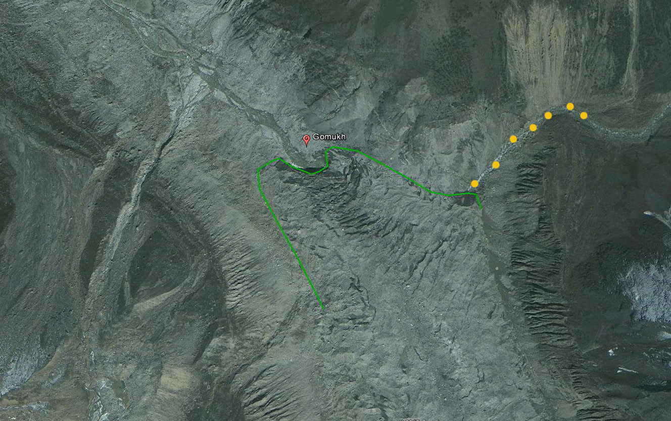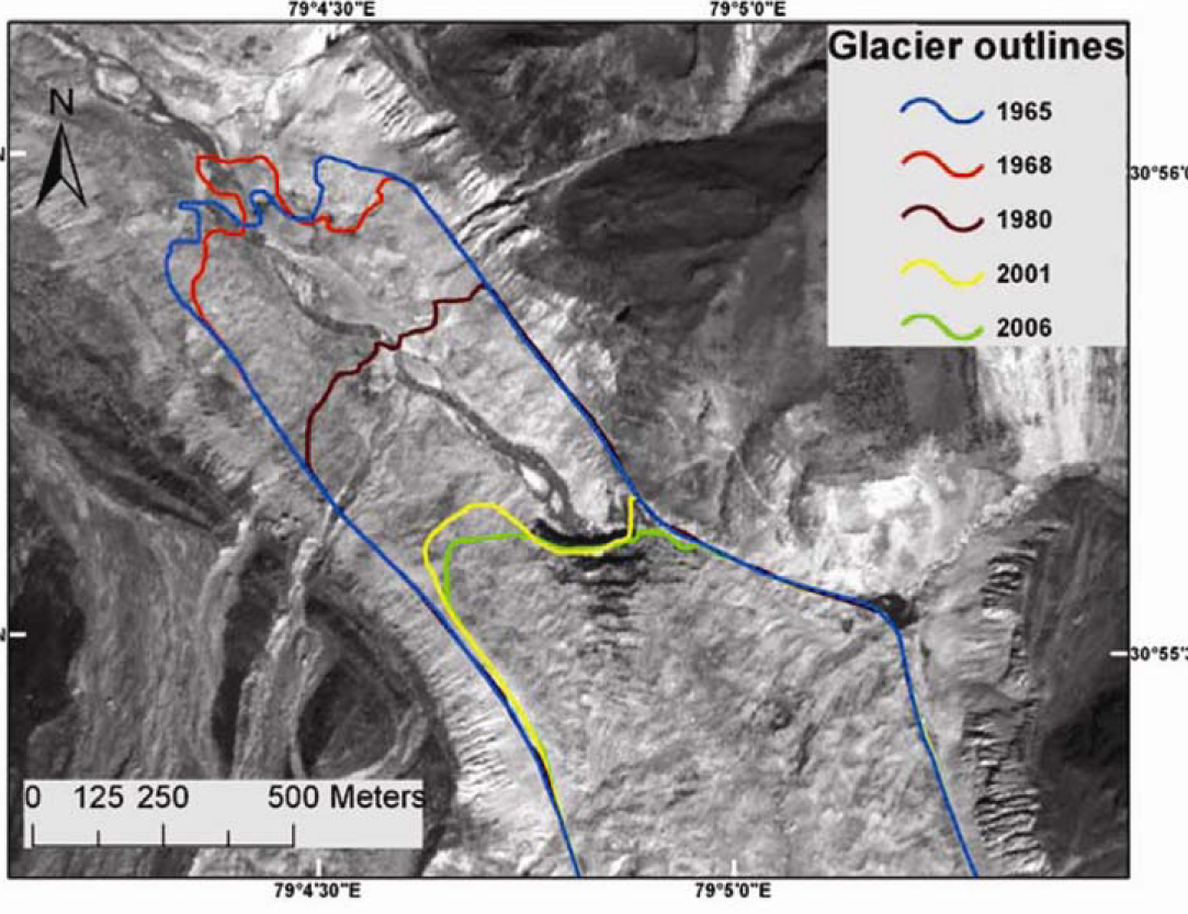 The Tons River is in Uttarakhand India. The watershed is fed by more than 50 glaciers. The largest are Jaundhar Barak and Bandarpunch, the glaciers of Tons valley are notable for a thick mantle of debris cover, due to the terrain characteristics, and the avalanche fed nature of the glaciers (Pankaj et al, 2012). The Tons River Basin has one significant operational hydropower unit, the Mori Hanol Hydro Power Project (70 MW) with a diversion dam downstream of Mori village. There are other proposed projects in the basin. Mehta et al (2013) observed the spatial changes of Jaundhar Barak, Jhajju and Tilku glaciers in the Tons River basin between 1962 and 2010 using Landsat Satellite data, topographic maps and field surveys. They estimated the overall loss in area to be 3.6 km2 (5.4%) and frontal retreat of 1,700 m, ∼ 800 m and ∼ 700 m for the Jaundhar Barak, Tilku and Jhajju Glaciers. The debris cover (DC) makes it quite difficult to easily identify terminus (T) position using Landsat imagery, Google Earth Imagery is not good either.