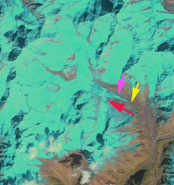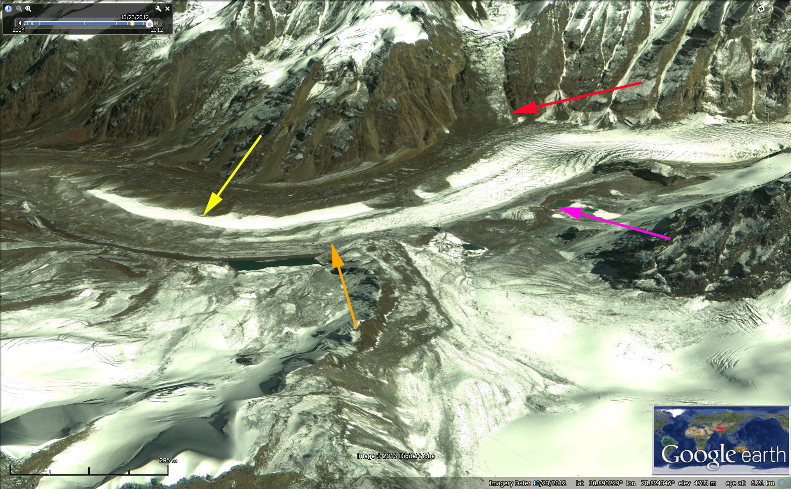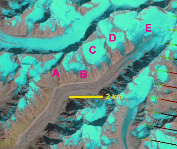 Here we use Landsat imagery to identify the retreat of five tributary glaciers that have fed or are feeding into the Jaundhar Barak from the ridge to its north from 2000 to 2012. Jaunhar Barak is a 19 km long glacier with a north and south arm, here we focus on the north arm. The glacier begins near 6000 m and quickly drains into the main valley, at 4900 m the debris cover begins and the lower 13 km of the glacier are debris covered to the glacier end at 3900 m . The tributary glaciers are each a potential income stream for the main glacier, which when lost lead to less snow and ice “income” for the main glacier and then thinning and retreat will follow. The Jaundhar Barak Glacier is The five tributaries are labelled A-E. A comparison of the 2000, 2011 and 2012 images below indicate that: At Point A in 2000 two arms of the tributary glacier joined and it flowed out of the high alpine basin it was in, by 2011 and 2012 the two glacier arms have separated and the glacier is confined to the upper basin. At Point B there is a well established glacier tongue that extends halfway from the tributary to Jaundhar Barak, and by 2012 this tributary terminus has pulled back 200 m, which is nearly 200 m of elevation change also. At Point C in 2000 this tributary joins the main valley glacier and a small tongue of blue ice, its contribution can be seen heading downglacier. By 2012 the Point C tributary no longer reaches the main glacier. At Point D in 2000 the tributary joins the main glacier and like the previous tributary contributes a small tongue of blue ice that heads down the Jaunhar Barak Glacier. By 2011 the Point D tributary is no longer reaching the main glacier. At Point E in 2000 this accumulation area for the glacier is nearly all covered with glacier ice, with only a couple of small bedrock areas seen below the Point. By 2012 the bedrock exposed has coalesced into a one kilometer region separating a portion of the upper glacier from the main valley glacier. The ice from this tongue still may reach the lower glacier via avalanching. The last decade of loss on tributary glaciers more than 10 kilometers above the terminus of Jaundhar Barak indicates that downwasting and retreat of this glacier will continue. This glacier follows the pattern of other glaciers in the Garhwal of the Himalaya in its retreat and downwasting, Jaonli Glaicer, Gangotri Glacier, Satopanth Glacier . It also will feeds hydropower projects as do the other glaciers.