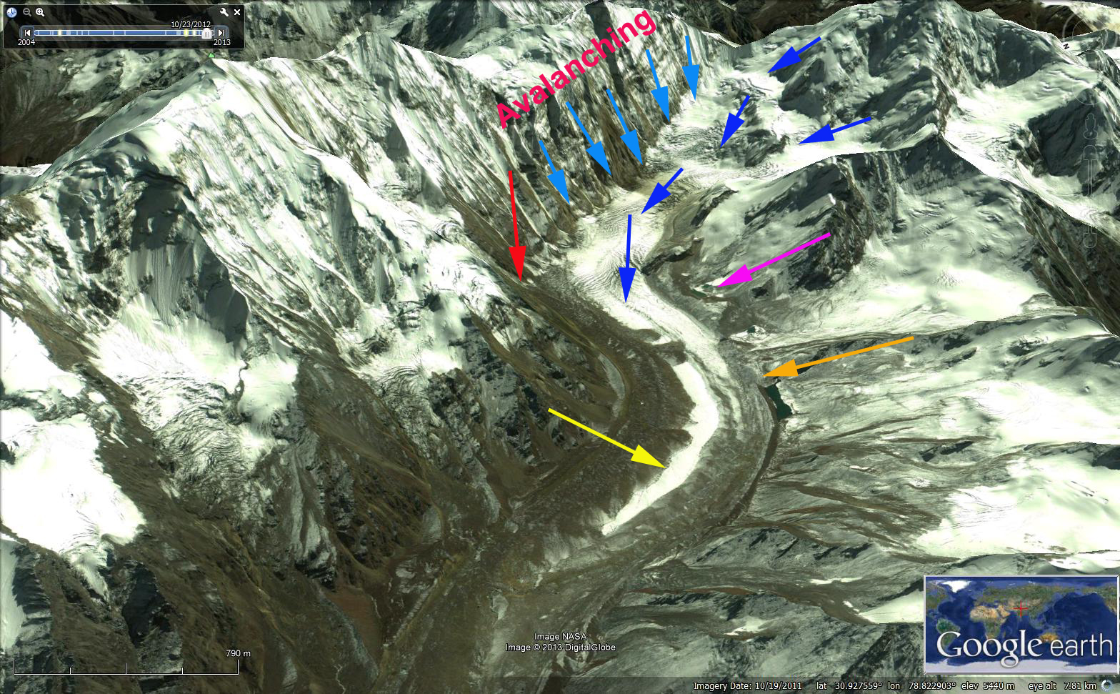 Jaundhar Barak Glacier in 2012 arrows indicate flow Debris cover=DC and Terminus=T, tributary glaciers of note discussed below A-E.