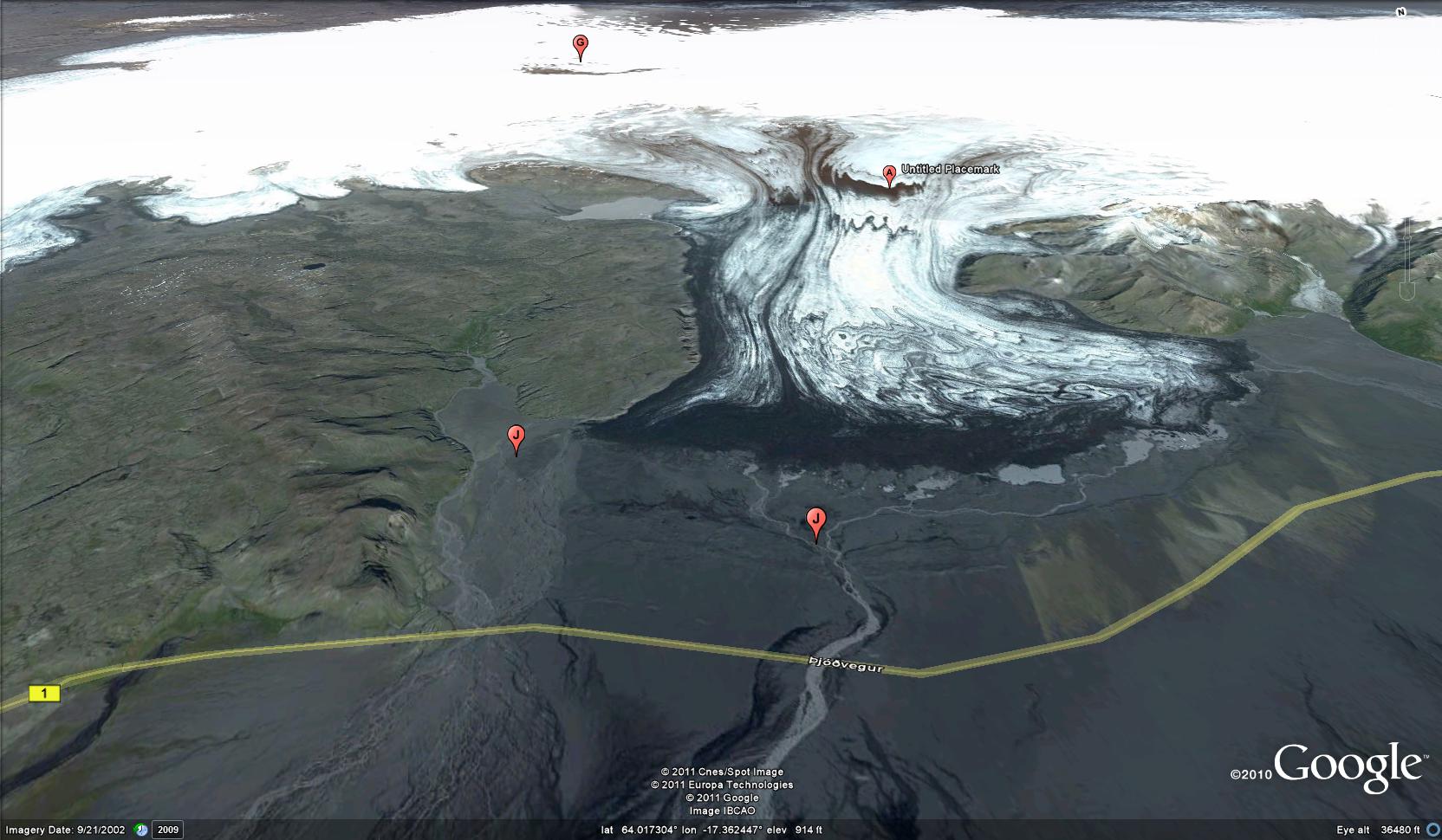 On May 20, 2025 the snow line on the southern part of the Öræfajökull Ice Cap averages 800 m, purple dots. SK=Skaftafells, SV=Svinafells, HR=Hrutarjokull, KV=Kviar, FJ=Fjalls, JL=Jokulsarlon Lagoon, H1=Southern Highway.