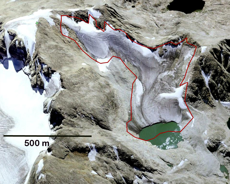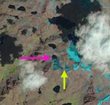 In 2016 the glacier is in three parts and glacier area has been reduced to 1.9 km². By 2022 additional fragmentation at the green arrow in the middle segment is imminent. The northern and southern parts are wasting away rapidly. A closeup of the northern section of the glacier in 2022 illustrates how thin, fragmented, and stagnant the ice has become. Point A-E indicate bedrock areas emerging amidst northern part. Point F-I indicate very thin, old, dark ice in the middle part. This glacier is following a similar path to the Grasshopper Glacier just to the south. Van Looy et al (2013) noted that in the next century the volume would be reduced by 43% and the glacier would be lost in 300-400 years. The pace of loss has increased significantly with volume loss of ~2% per year since 2013, which will lead to loss of all areas with less than 40 m of ice in 2012 being lost by 2040. The two areas of deep ice will persist much longer. This same trend has led to the loss of Heap Steep Glacier, Harrower Glacier and Twins Glacier in the Wind River Range since 2015.